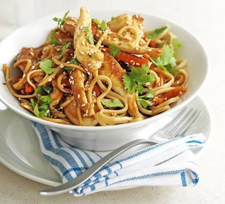 Sticky Chicken Stir-fry With Sesame Seeds With Egg Noodles, Sunflower Oil, Chicken Breasts, Carrots, Clear Honey, Limes, Sesame Seeds, Coriander